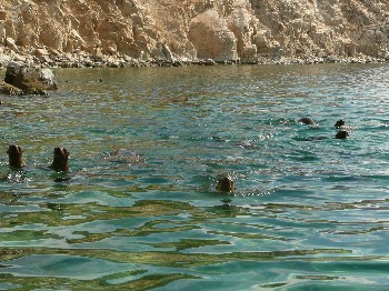 They were just like little children crowding together to watch a puppet show at a fair. Keeping my face in the water I swam backwards so I could watch them both under and above the water, then turned over to the regular face-down position so I could more clearly see what was going on under the water.