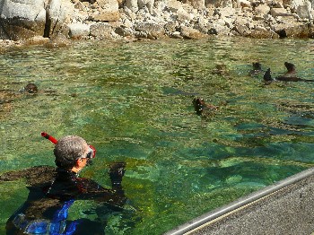 So as soon as we were anchored and I was pretty sure a big bull sea lion was not going to head my way, I slid over the side of the dinghy into the water, much faster than Garett had expected I think. In the twinkling of an eye, I was surrounded with little bodies twisting and turning under the water, around and under me, heads popping out of the water to check out Garett in the dinghy behind me.