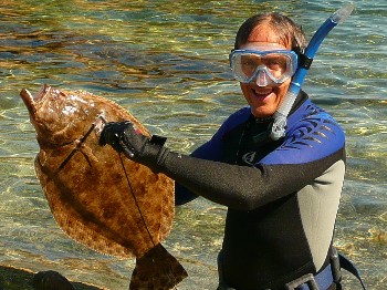Carllie wanted to go on a snorkel on her own so I experimented by rigging up Carllie with one more two-pound weight as we had noticed that she is still quite buoyant with her new wetsuit on. With the extra weight it gave her now a total of six weights for a total of 12 pounds (equivalent to a small anchor) and she snorkeled on her own to the nearby rocks. She found that the extra 2 pounds really made a difference and allowed her to get to the bottom and stay there better. She reported that there were a lot of fish so though it was almost 5 p.m. she encouraged me to see if I could get another fish for dinner.
