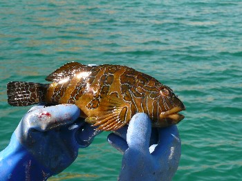 Today I saw my fist golden grouper. What an incredible looking fish! In the underwater world here which is colored in muted greys, greens, and black, this beautiful fish really stands out. I could see him just at the periphery of my vision (about 30 feet) circling around. I eventually concluded that he stayed around one particular rock. In between glimpses of him I kept diving to the bottom at 10 to 15 feet and fishing for the more prolific and less wary leopard grouper and the Mexican hogfish.