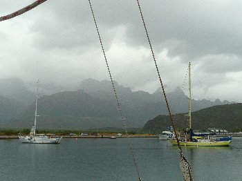 Carllie: As predicted, the wind came up in a big way from the south. And it rained like the Pacific Northwest in the wintertime (right now!). We felt right at home, but eventually grew tired of the limitations imposed by rain and the mess it makes on the cabin and hull floors.